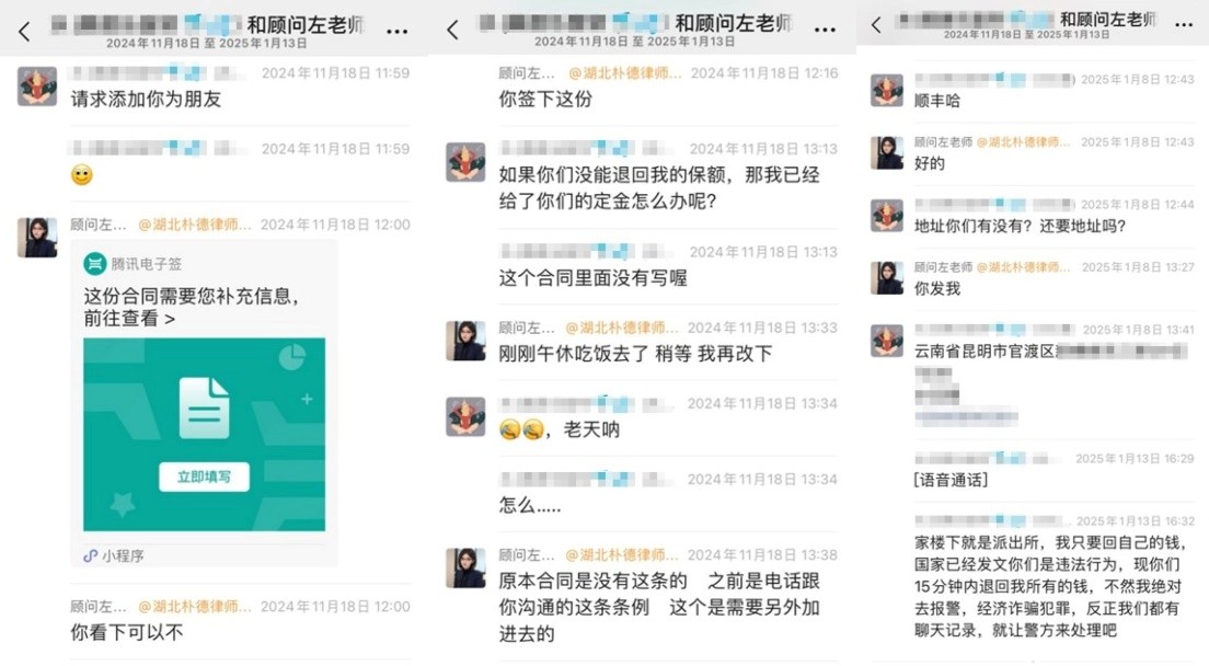 2024年12月,江西客戶S女士在網(wǎng)上看到一則“代理退?!钡膹V告,聲稱“全額退保,不成功不收費”。因當(dāng)時經(jīng)濟壓力較大,并且缺乏對黑產(chǎn)中介的了解,S女士接觸了該所謂的“專業(yè)代理機構(gòu)”。在對方的誘導(dǎo)下,客戶以“銷售誤導(dǎo)”等虛假理由投訴保險公司,要求全額退保,同時還向?qū)Ψ街Ц读?800元作為“定金”。然而后續(xù)幾天,S女士始終沒有等到對方的消息。