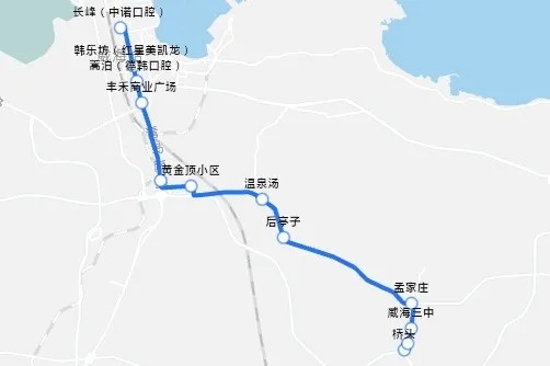 橋頭、橋頭稅務(wù)、威海三中、孟家莊、后亭子、溫泉湯、黃金頂小區(qū)、江家寨、豐禾商業(yè)廣場(chǎng)、蒿泊、韓樂坊、長(zhǎng)峰,共12站。