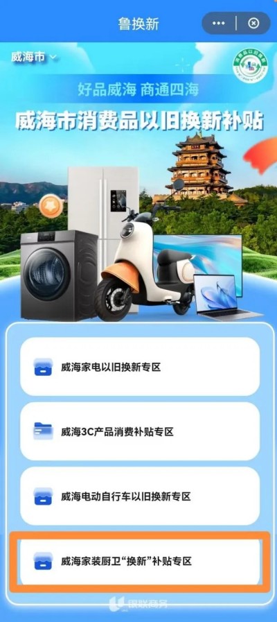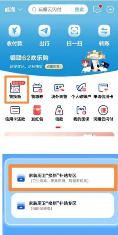 1.登錄平臺(tái)。打開云閃付App升級(jí)至最新版本,打開手機(jī)定位功能,并允許獲取位置信息。確認(rèn)首頁(yè)左上角的位置為“威海市”,在云閃付App搜索進(jìn)入“魯換新”小程序。點(diǎn)擊左上角“請(qǐng)選擇地市”,在下拉菜單中選擇“威海市”,點(diǎn)擊確認(rèn),進(jìn)入威海家裝廚衛(wèi)“煥新”補(bǔ)貼專區(qū)(衛(wèi)生潔具、家具照明、智能家居類)。