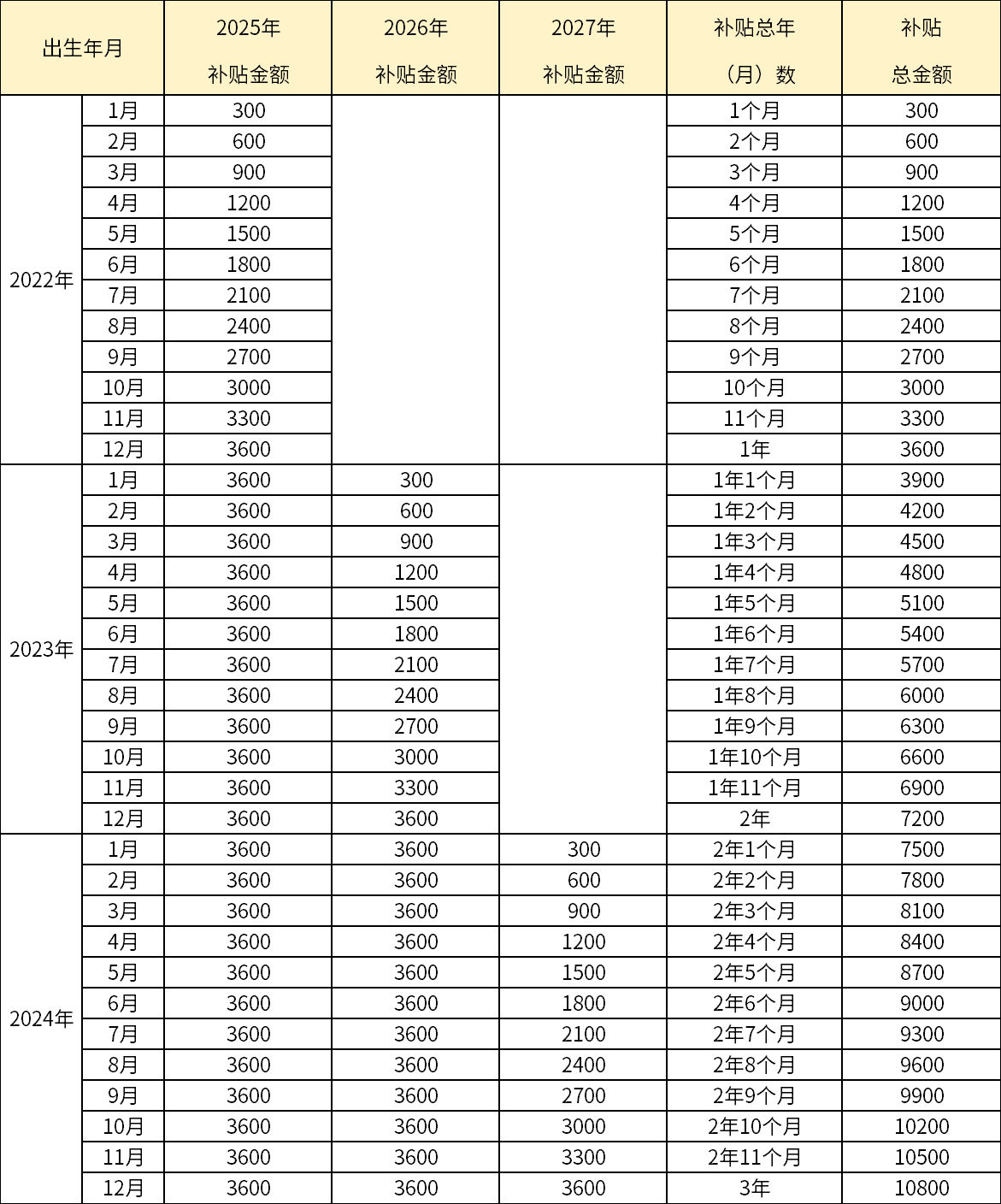 (2)對(duì)于2025年1月1日前出生且未滿3周歲的嬰幼兒,可按應(yīng)補(bǔ)貼月份折算計(jì)發(fā)補(bǔ)貼金額。先申領(lǐng)整年補(bǔ)貼,再申領(lǐng)剩余月份補(bǔ)貼。具體算法見(jiàn)下表。