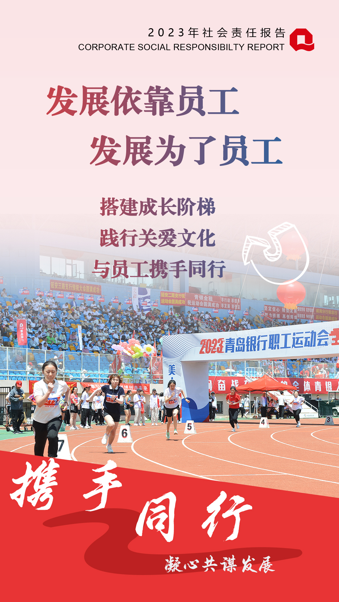 2023年,青島銀行堅(jiān)持“高質(zhì)量履責(zé)”與“高質(zhì)量發(fā)展”同行,對(duì)內(nèi)堅(jiān)持“發(fā)展依靠員工,發(fā)展為了員工”理念,為員工搭建成長平臺(tái),踐行關(guān)愛文化,與員工攜手同行共成長;對(duì)外積極投身社會(huì)公益,向善而行,著力構(gòu)建具有青銀特色的慈善公益體系。