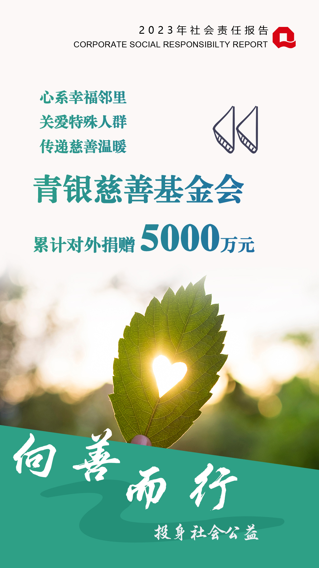 作為地方法人銀行,青島銀行始終秉持回饋社會(huì)的理念,積極投身公益事業(yè),不斷書寫“人民金融”的新篇章:“幸福鄰里”深入社區(qū),開展“黨建+志愿”活動(dòng)718場(chǎng),讓群眾感受“不一樣”的金融服務(wù),受眾達(dá)5.53萬人;關(guān)愛特殊人群,“青馨服務(wù)”再向前一步,銀發(fā)服務(wù)交出溫情答卷,“青馨工作室”獲中國金融工會(huì)“全國創(chuàng)新工作室”命名表彰;青銀慈善基金會(huì)傳遞慈善溫暖,積極開展捐資助學(xué)、扶弱濟(jì)貧、綠色公益、美麗鄉(xiāng)村建設(shè)等公益活動(dòng)。2023年,青島銀行、青銀慈善基金會(huì)合計(jì)對(duì)外捐贈(zèng)367萬元,榮獲“青島紅十字博愛金獎(jiǎng)”、《大眾日?qǐng)?bào)》“2023年社會(huì)責(zé)任企業(yè)”榮譽(yù)稱號(hào)。