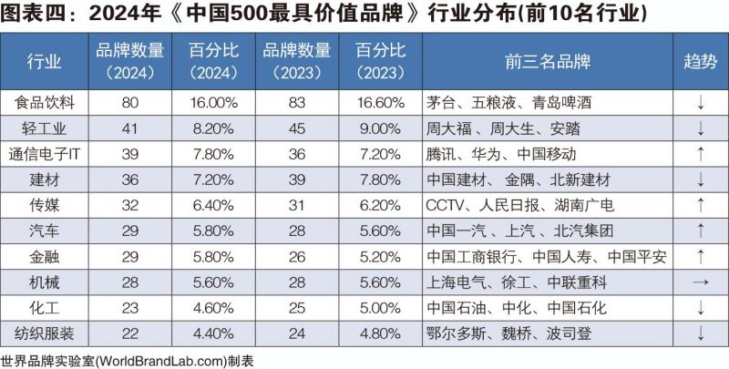 本年度《中國500最具價值品牌》排行榜中,共有來自食品飲料、輕工業(yè)、建材、傳媒、紡織服裝、醫(yī)藥、機(jī)械等在內(nèi)的24個相關(guān)行業(yè)的品牌入選。其中食品飲料業(yè)依然是入選品牌最多的行業(yè),共有80個品牌入選,占總?cè)脒x品牌數(shù)的16.00%;入選數(shù)量位居第二到第五的行業(yè)分別是輕工(41個)、通信電子IT(39個)、建材(36個)、傳媒(32個)。在衡量品牌的忠誠度時,世界品牌實(shí)驗(yàn)室參考了我信品牌(iTrust Rating)的評級數(shù)據(jù);在衡量品牌的領(lǐng)導(dǎo)力特別是ESG(環(huán)境、社會和治理)評分時,參考了超級財(cái)經(jīng)(SuperFinance)的ESG數(shù)據(jù)庫。同時還借用了低碳國際(Carboncare International)對品牌企業(yè)碳排放的計(jì)量,以推動品牌添加“碳排放評分”標(biāo)簽。