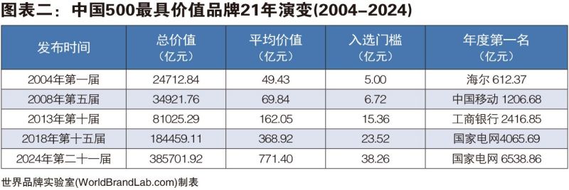 2024年《中國500最具價值品牌》的總價值為38.57萬億元,比去年增加4.24萬億元,增幅為12.35%。世界品牌實(shí)驗(yàn)室學(xué)術(shù)委員會主席、牛津大學(xué)(Oxford)營銷學(xué)榮譽(yù)教授斯蒂芬·沃格(Steve Woolgar) 博士表示:“在過去的20多年中,我目睹了中國品牌的快速成長,有的已經(jīng)具有強(qiáng)大的世界影響力,這些品牌包括國家電網(wǎng)、海爾、中化、華潤、中國南方電網(wǎng)、保利、河鋼、中國華電、五糧液、徐工、青島啤酒、中國國航、北大荒、東方電氣、通威、波司登、飛鶴、中國航油、恒力、協(xié)鑫、圣象、九牧、長虹、雙星輪胎等?!笔澜缙放茖?shí)驗(yàn)室編制中國品牌報(bào)告已是第21個年頭,2004年入選門檻僅為5億元,前500名品牌的平均價值為49.43億元。21年以后的2024年,入選門檻已經(jīng)提高到38.26億元,而前500名品牌的平均價值高達(dá)771.40億元,增幅為1460.59%。本年度共有108個中國品牌的價值超過1000億,比去年增加36個,彰顯了中國品牌經(jīng)濟(jì)的繁榮。